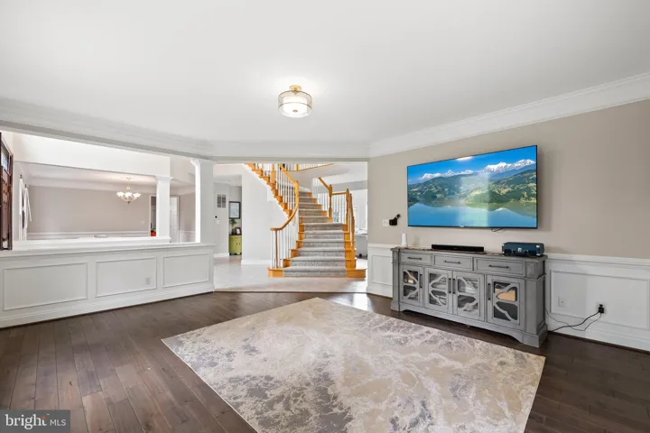 Step inside to a grand foyer with a dramatic curved staircase, setting a sophisticated tone that carries throughout the home. The gourmet kitchen features white cabinetry, granite countertops, stainless steel appliances, and opens directly to the rear deck—perfect for seamless indoor-outdoor entertaining. Just off the kitchen is a soaring two-story family room with floor-to-ceiling windows and a floor-to-ceiling stone gas fireplace that anchors the main level, filling the space with natural light and expansive views. A private office provides an ideal space to work from home.