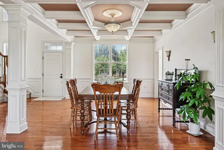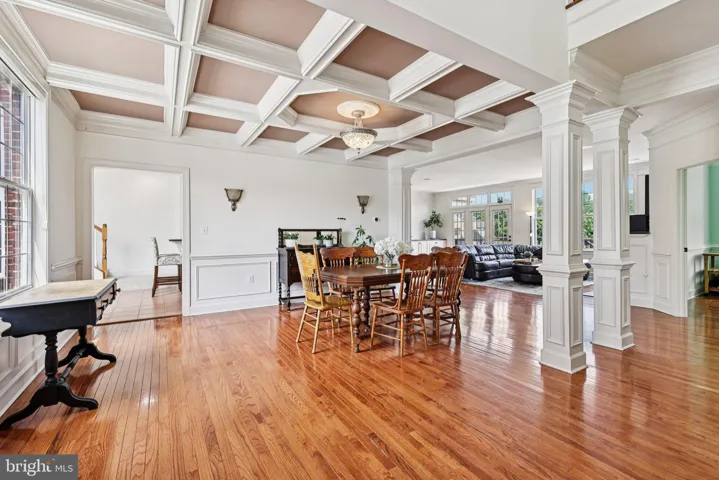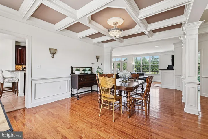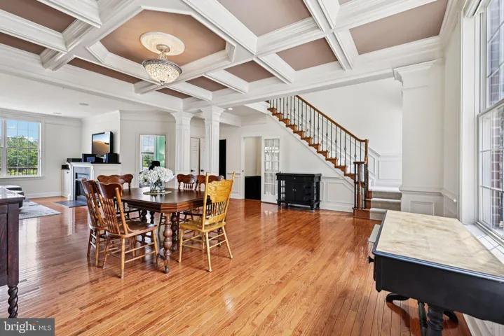 Every detail has been thoughtfully curated, from the professional-grade Viking appliances and 700-bottle wine cellar to the premium display cabinetry, wet bar, built-in wine cooler, and warming trays in both the kitchen and on the deck. The kitchen flows seamlessly into an open dining area with custom built-in shelving, while boxed beam and coffered ceilings add architectural depth throughout the main living spaces. Custom closet systems throughout the home provide both function and style, creating a cohesive, elevated aesthetic.