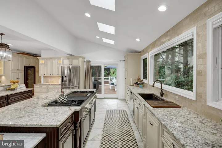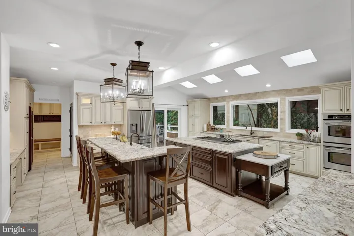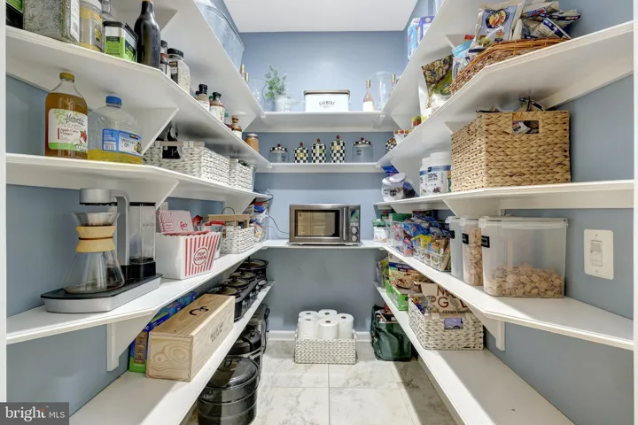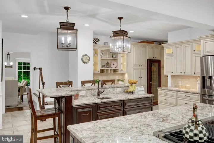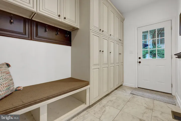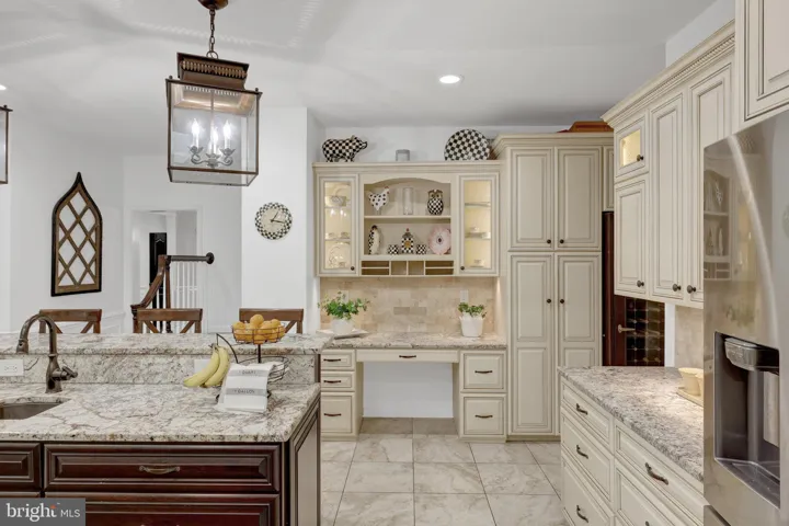 The spacious chef’s kitchen is thoughtfully designed and features multiple task areas, task and decorative lighting, cabinetry with rollout shelves, a breakfast bar, a desk with display cabinets and a butler’s pantry. There are higher-end appliances such as a 48 in rangetop with griddle and double ovens, dishwasher, and wine cooler. Granite countertops, a marble-topped pastry counter, and stainless steel accents contribute to this kitchen’s appeal. Storage is plentiful and there’s a separate walk-in pantry too. And, there’s a mudroom to store backpacks, coats and more.