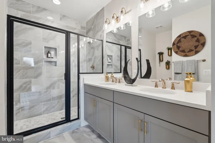 The main level features a spacious primary suite with a walk-in closet and a luxurious primary bath with upgraded cabinets and a modern shower, complete with a seat and a frameless shower door. A second bedroom, a full bathroom, and a conveniently located laundry room are just steps from the two-car garage, making everyday tasks a breeze.