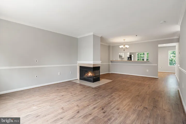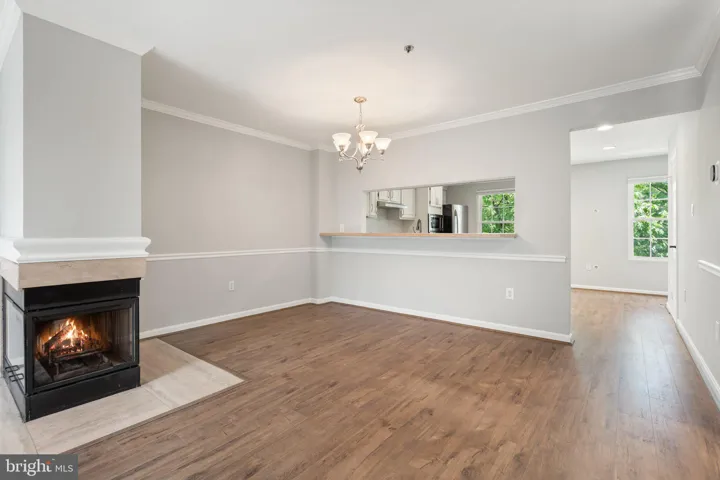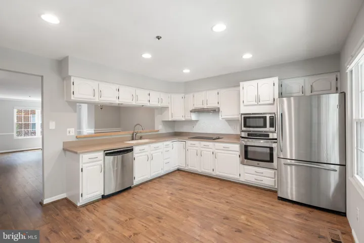 Main level showcases an inviting living room with a fireplace, a dedicated dining area, powder room, and an expansive kitchen with stainless steel appliances, pristine white cabinetry, and upgraded countertops