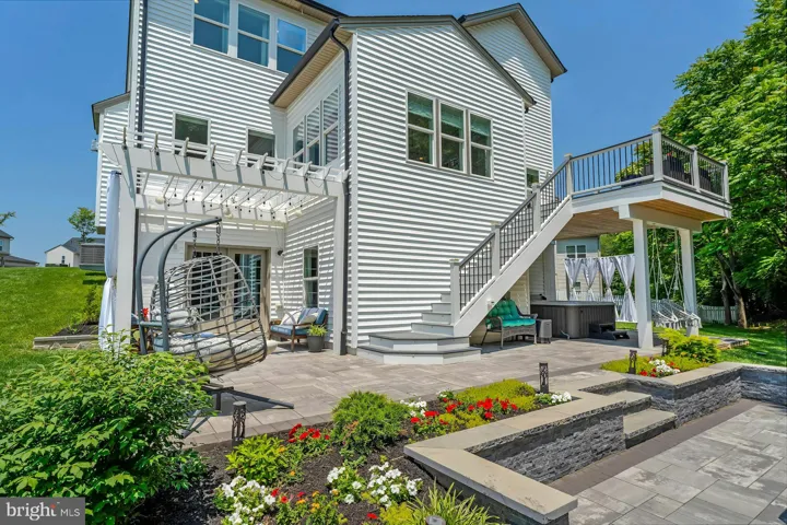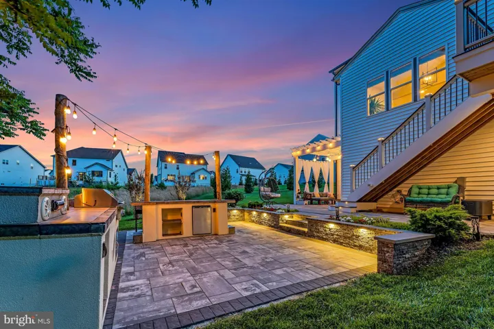 Step outside to your private backyard retreat featuring a covered 7-person spa with privacy curtains, a 16×12 pergola with café lighting, an outdoor kitchen, and beautifully designed hardscape areas.