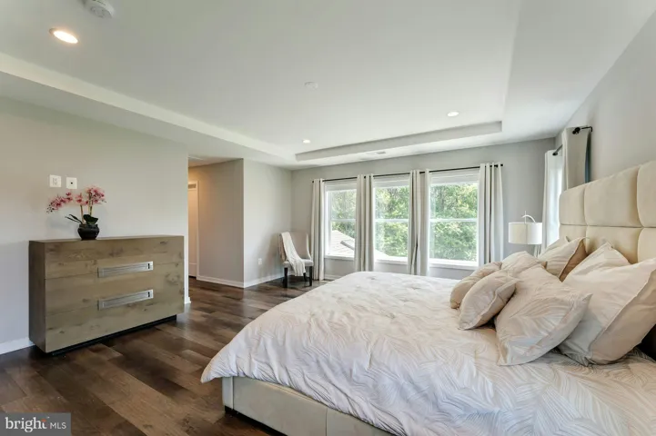 Upstairs, the luxurious primary suite offers serene wooded views, dual walk-in closets, and a spa-like bath with dual shower heads, including a rainfall fixture. The wide-plank engineered wood flooring continues in the primary bedroom and upper hallway, adding warmth and style. Three additional bedrooms, two full baths, and a convenient laundry room complete the upper level.