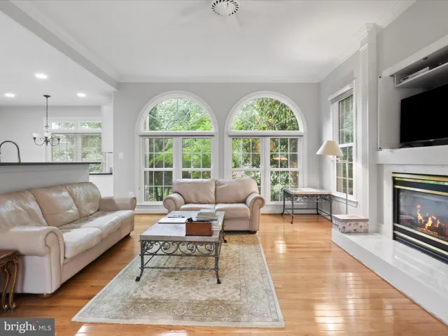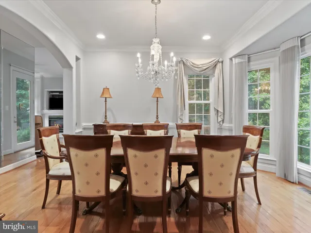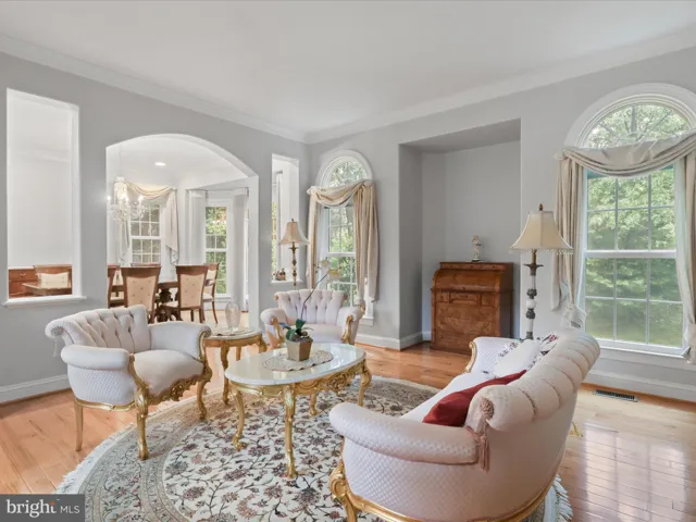 The formal living room connects seamlessly to the spacious formal dining room through an elegant arched entryway. The dining area is enhanced by dual exposures and a large bay window, allowing the space to be flooded with natural light.