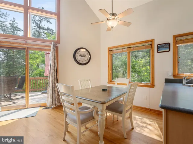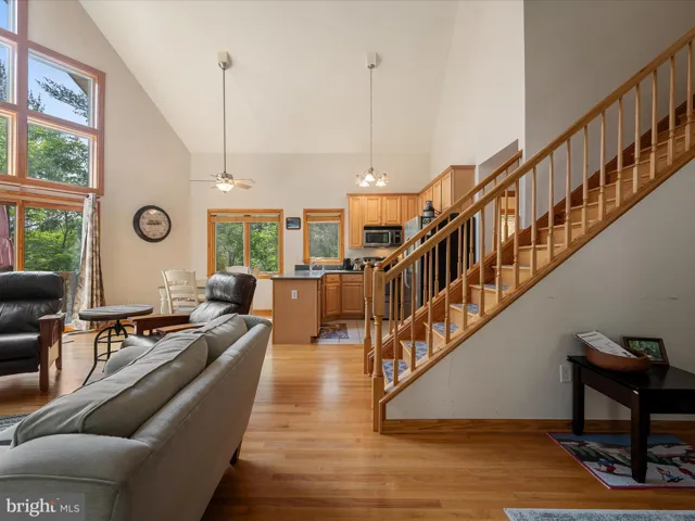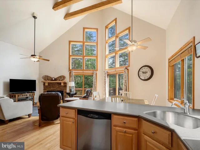 Step into the expansive great room, where towering vaulted ceilings and exposed wooden beams create a grand yet inviting atmosphere. Sunlight pours through generous windows, illuminating the hardwood floors and highlighting the stone wood-burning fireplace. This space transitions effortlessly from cozy winter nights in after skiing to relaxing Spring through Fall gatherings.