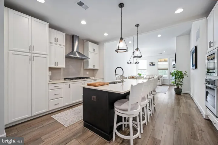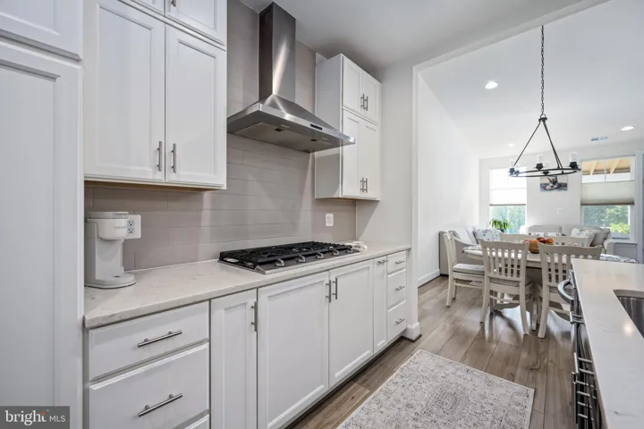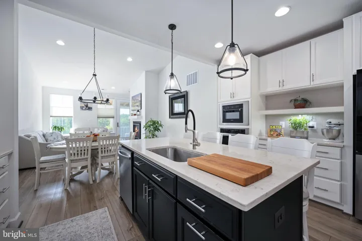 The warm and inviting family room features a cozy gas fireplace and flows seamlessly into the gourmet kitchen—complete with a gas cooktop, wall ovens, center island, quartz countertops, and ample prep space for entertaining or everyday living.