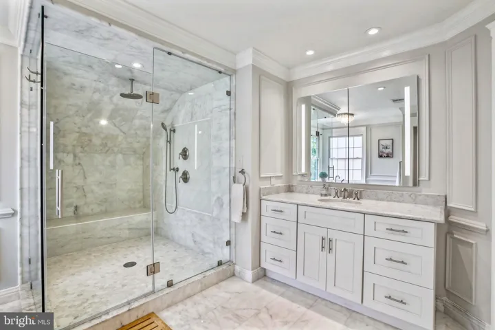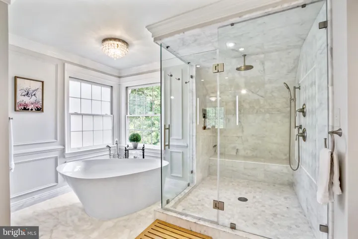 Upstairs, the spacious primary suite offers a walk-in closet with a custom built-in wall unit and a fully renovated spa-inspired en-suite bath featuring heated floors, double vanities, a soaking tub, and a built-in steam shower. A secondary bedroom includes its own private attached bath, while two additional bedrooms share a full bath with convenient Jack-and-Jill access.