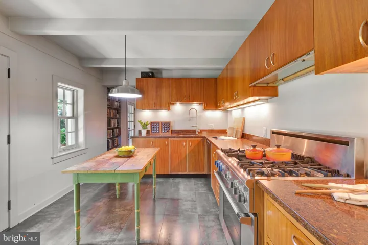 Inside, you’ll find reclaimed barnwood floors and sun-drenched rooms that flow effortlessly from space to space. The stunning chef’s kitchen features a commercial-grade refrigerator, Thermador dual-fuel range, Miele dishwasher, and artisan cabinetry. French doors lead outside, where butterflies and birds animate a true garden paradise. From the kitchen, the elegant foyer leads into a welcoming living room with reclaimed barnwood floors, a charming wood stove, and handcrafted wood shutters—perfect for relaxing evenings or intimate gatherings.