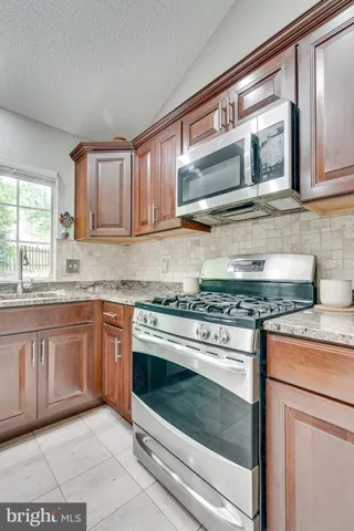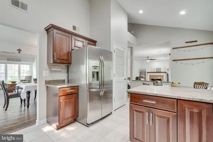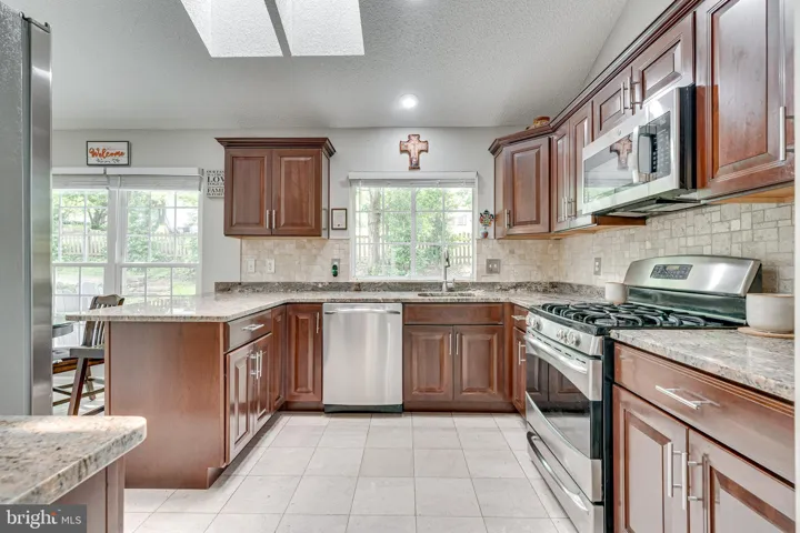 The kitchen shines with natural light from skylights above, granite countertops, and gas cooking — ideal for preparing your favorite meals. Nearby, the breakfast nook offers cozy views of the private backyard and connects directly to the inviting living room with a wood-burning fireplace.