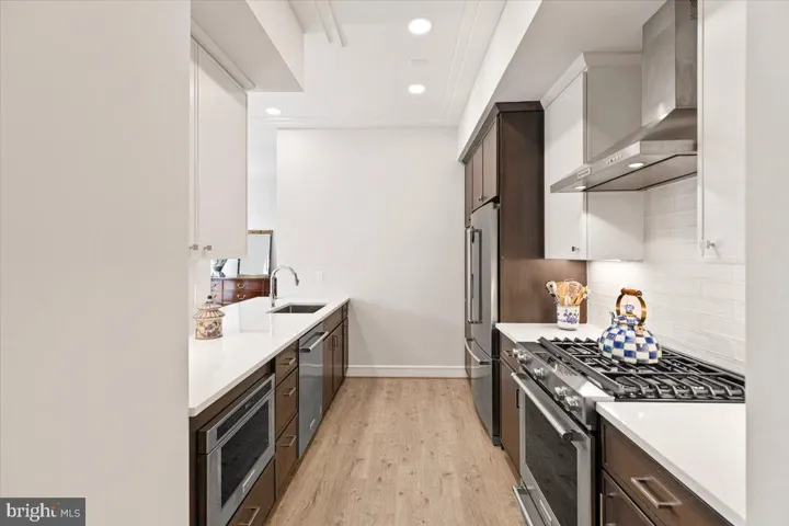 The kitchen is both functional and stylish, outfitted with high-end KitchenAid stainless steel appliances, two-toned Micro Shaker cabinets in stone and white, Carrara Morro quartz counter tops, and a timeless white subway tile back splash. A large center island opens to the sunlit living area—ideal for everyday living or entertaining.