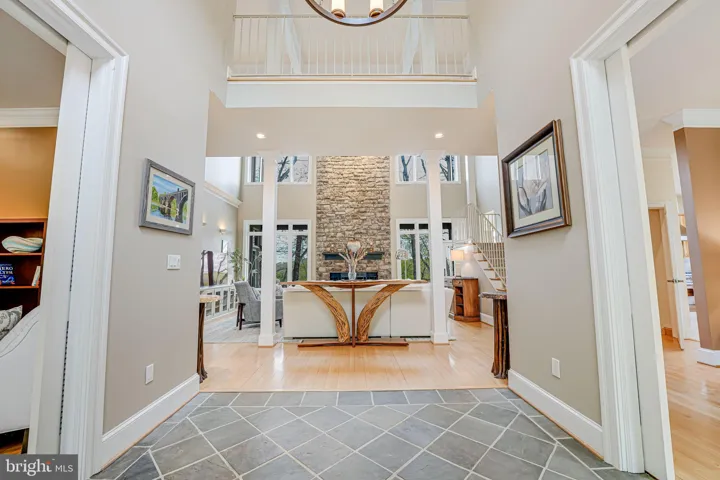 Step into the two-story slate foyer with a substantial office to the left and a dining room and butler’s pantry to right. Straight ahead is the living area with 20-foot ceilings, stone fireplace, wood floors, and a stretch of windows that let in light and a spectacular view of the woods and river.