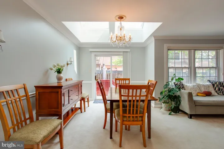 The light-filled main level includes an entrance foyer with closet, guest bathroom, galley kitchen, a dining area with skylights, living room with fireplace, and direct access to a fully fenced-in private patio, ideal for outdoor entertainment.