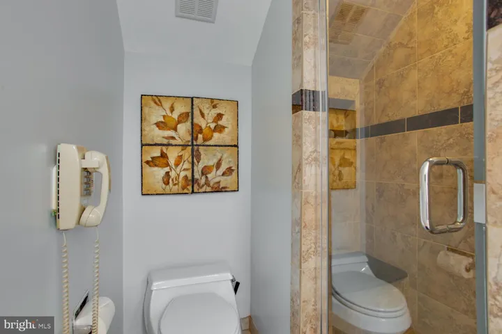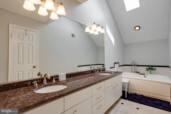 The bright top floor with skylight windows features a third bedroom with an area for office and a full bathroom with double vanity and a luxurious steam shower and jacuzzi tub, perfect for relaxation.