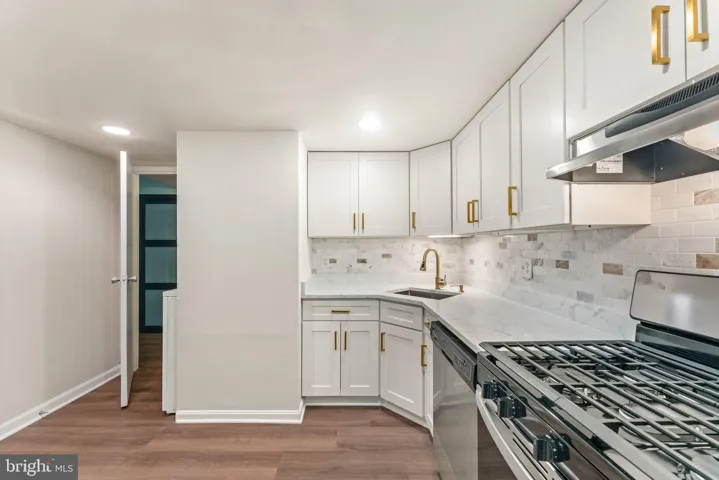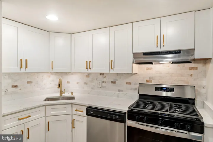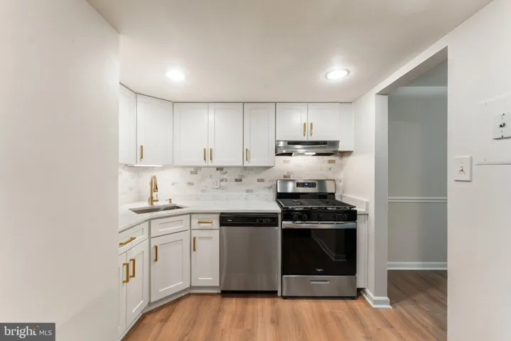 The fully remodeled kitchen features brand-new soft-close cabinets, quartz countertops, under-cabinet lighting, and new appliances—including the stove, oven, washer, and dryer. The open layout flows seamlessly into the dining and living area, creating a bright and inviting space filled with natural light.