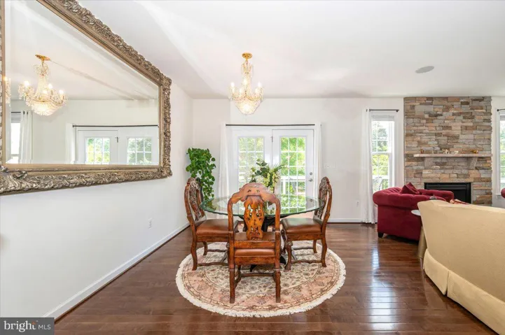 On the main level, sunlight pours through additional windows, highlighting the gleaming hardwood floors and creating an open, airy ambiance. The formal living and dining areas flow seamlessly into a cozy family room, where a gas fireplace with stacked stone surround becomes the perfect gathering spot.