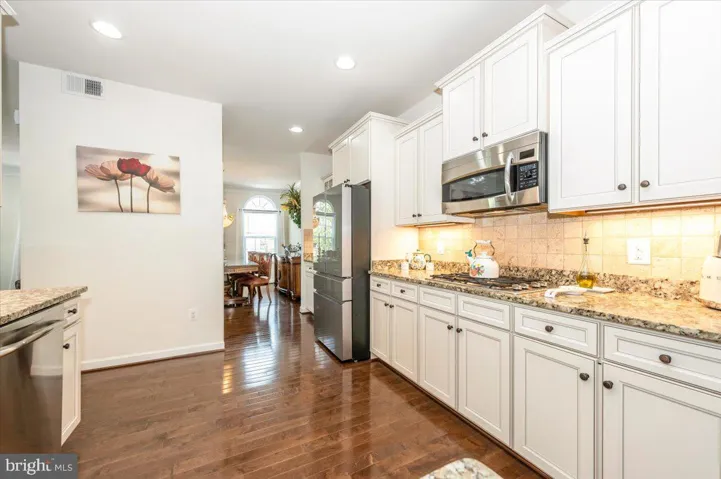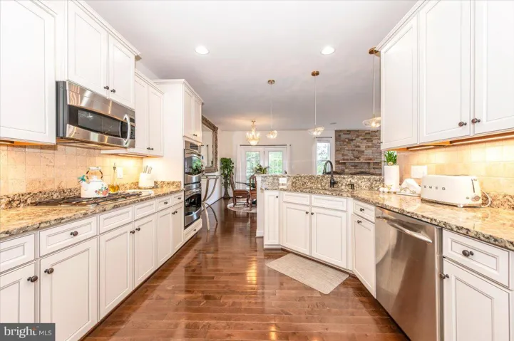 At the heart of the home is the chef-inspired kitchen, featuring white cabinetry, granite countertops, stainless steel appliances, stylish pendant lighting, and a brand-new Café refrigerator – a blend of luxury and practicality ideal for daily living and entertaining alike.
