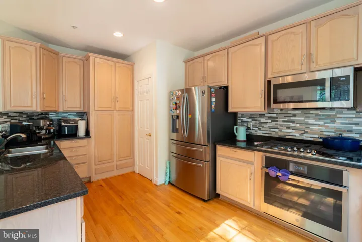Gourmet kitchen features stainless steel appliances, granite countertops, and a gas cooktop—ideal for home chefs.