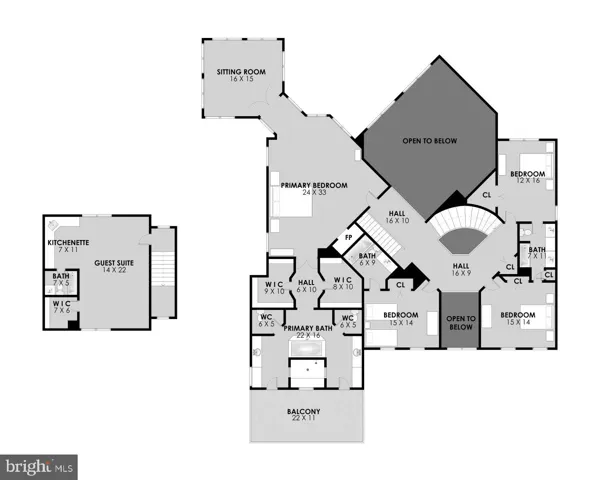 A detached two-car garage with finished living space above offers privacy for guests or an ideal home office, featuring a full bath, kitchen area, and expansive open space. The attached garage, connected by a covered portico, provides additional convenience.
