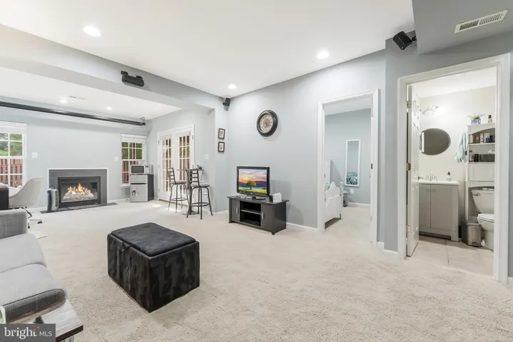 The finished lower level includes a cozy rec room with a fireplace, a full bath, a fourth bedroom, and walk-out access to a patio and private yard.