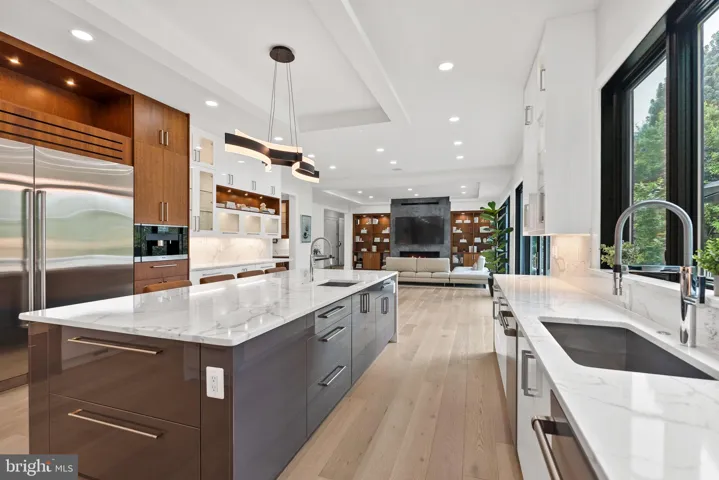 The chef’s kitchen is a true culinary statement—outfitted with Sub-Zero and Wolf appliances, dual dishwashers, custom German Rehau cabinetry, and a built-in Miele espresso system. The space opens to a sunlit breakfast area and a central family room anchored by a sleek linear gas fireplace, custom built-ins, and walls of glass leading to an expansive stone terrace and landscaped yard—complete with a newly completed, heated pool with a retractable power cover.