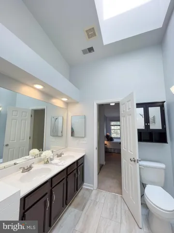 PRICE IMPROVEMENT! Welcome to this spacious and delightful top-floor condo in Stratford Place, Kingstowne, featuring 2 bedrooms, 2 baths, and a versatile 3rd bedroom/sunroom/office. With an abundance of natural light streaming through a wall of windows and two skylights, this home highlights tall vaulted ceilings and elegant wide-planked espresso floors. The inviting living room, centered around a wood-burning fireplace, seamlessly opens to the dining area, creating a perfect flow for entertaining or relaxed meals.
