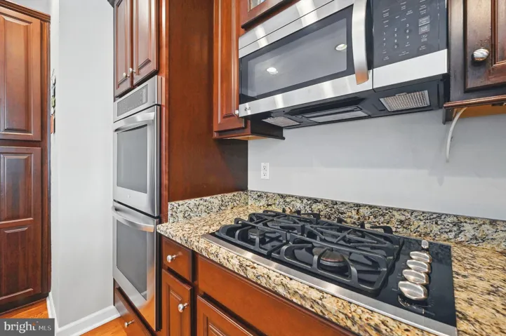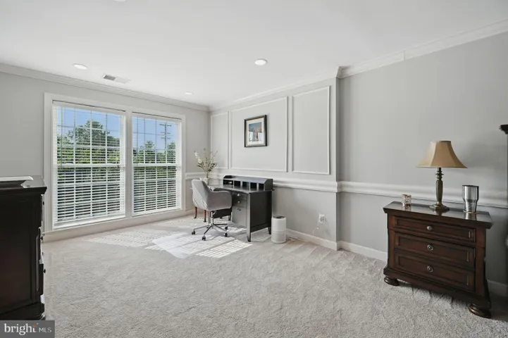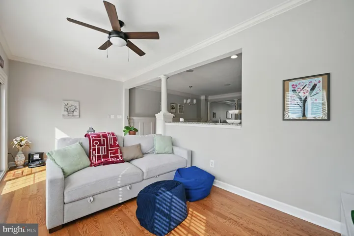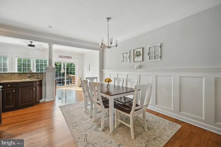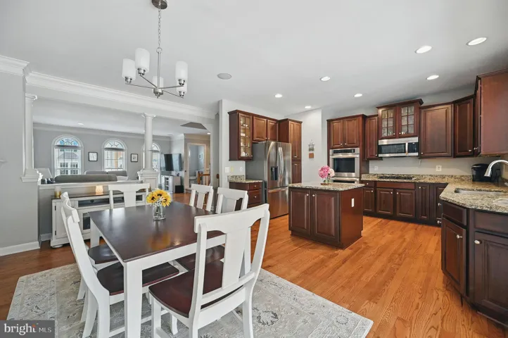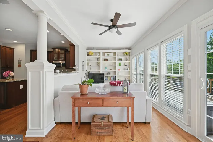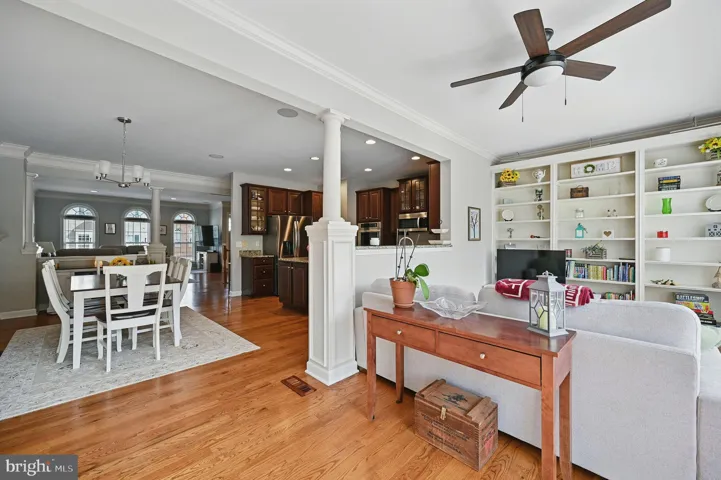 The open-concept layout includes a spacious living and dining area with hardwood flooring throughout. The gourmet kitchen is equipped with granite countertops, stainless steel appliances, and a sunny morning room bump out with built in bookshelves that provides additional space for dining or relaxation.