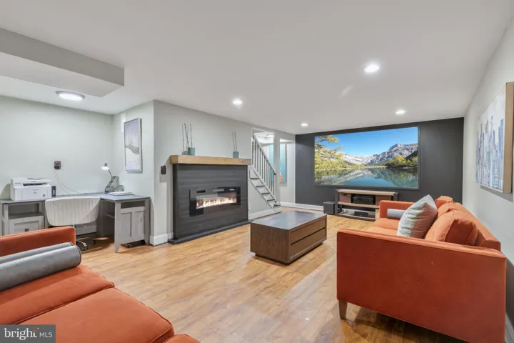 with an electric fireplace, a convenient office nook, a full bathroom, and a private fourth