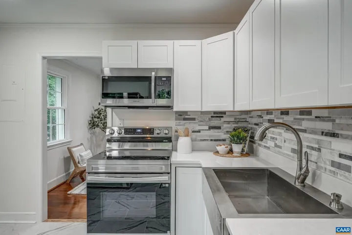 Wow! Completely renovated inside with new modern HVAC, new Tankless Hot Water Heater, new Kitchen, New Bathroom, new windows, new drywall and refinished floors! This charming cottage home tucked off of Rugby Road is surrounded by mature trees, with a newly landscaped and seeded yard. Inside, the cozy living room opens to the remodeled kitchen with quartz countertops, tile backsplash, white cabinets, and stainless steel appliances. Everything is brand new! Two bedrooms share a full hall bathroom with new tiled floor and shower, new plumbing and a high-end washer/dryer combo hidden behind the sliding barn door! A flexible room next to the kitchen can be a home office, dining room or third bedroom. New tankless hot water heater for instant hot water too! Enjoy the beautiful landscaping around the patio at the rear of the home. Don’t miss your chance at this city charmer!,Quartz Counter,White Cabinets