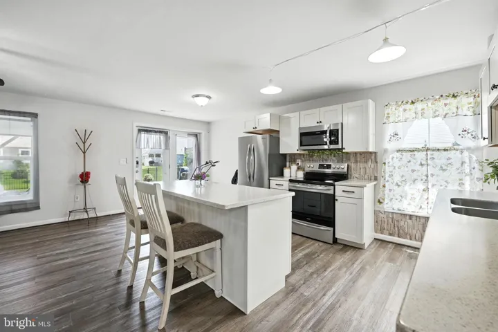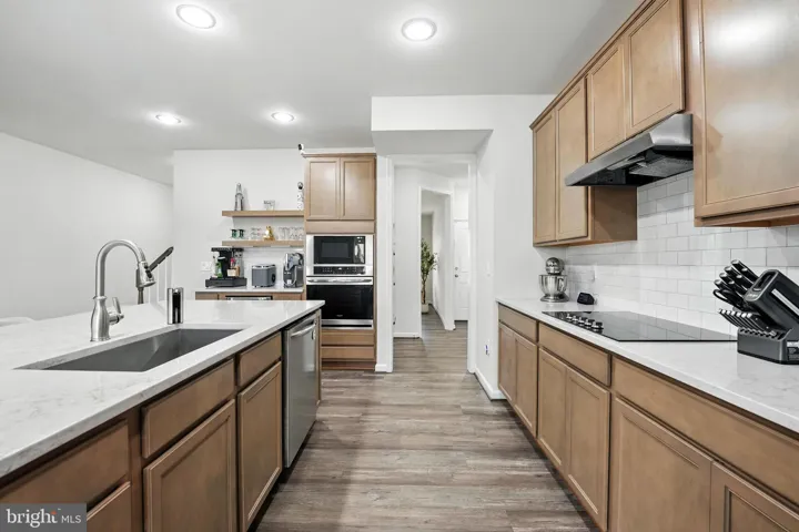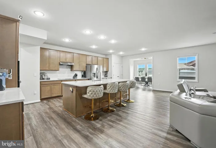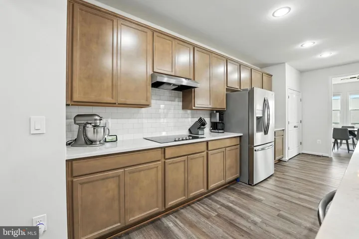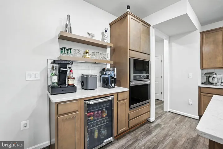 The Gourmet Kitchen features upgraded Cabinetry, quartz countertops, ceramic tile backsplash, large center island, and stainless steel appliances.