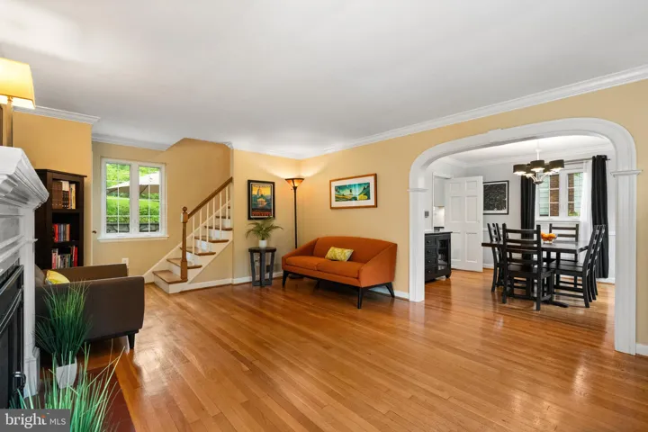 Inside, this 3BR, 2BA, three-level home offers two distinct living spaces on the main level, including a welcoming living room with hardwood floors, crown molding, and a central fireplace. The adjacent sunroom/library is lined with attached built-in cabinetry—ideal for reading, working, or simply soaking in the garden views.