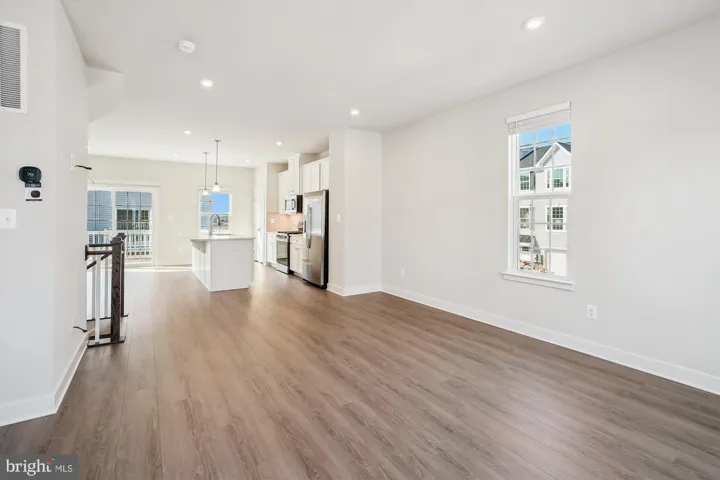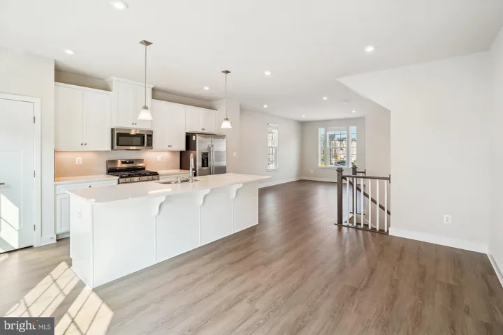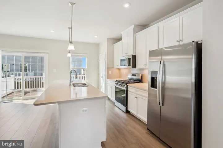 The main level features an open-concept floor plan with luxury vinyl plank flooring, 9-foot ceilings, and abundant natural light. The gourmet kitchen is a showstopper, complete with 42” cabinets, quartz countertops, stainless steel appliances, and a large center island with seating—perfect for entertaining or casual dining. Just off the kitchen, enjoy indoor-outdoor living with a private deck.