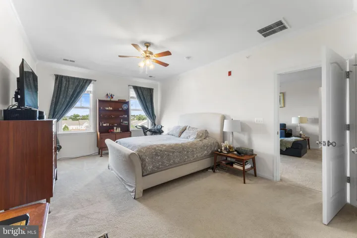 The primary suite is tucked away to the left of the main living space, offering privacy from the other bedrooms. It includes an impressively large walk-in closet and a generously sized bathroom that feels luxurious and well-planned. The two additional bedrooms are located on the other side of the condo, each with their own walk-in closets, adding to the overall feeling of space and storage throughout the home.