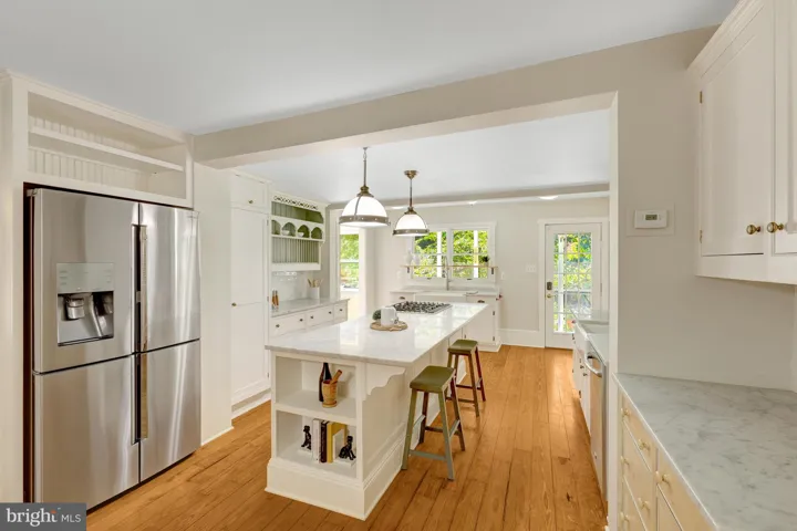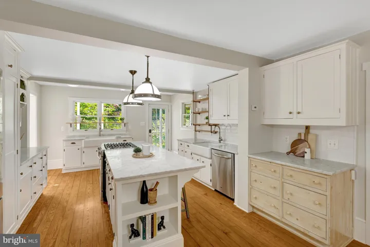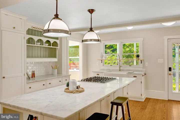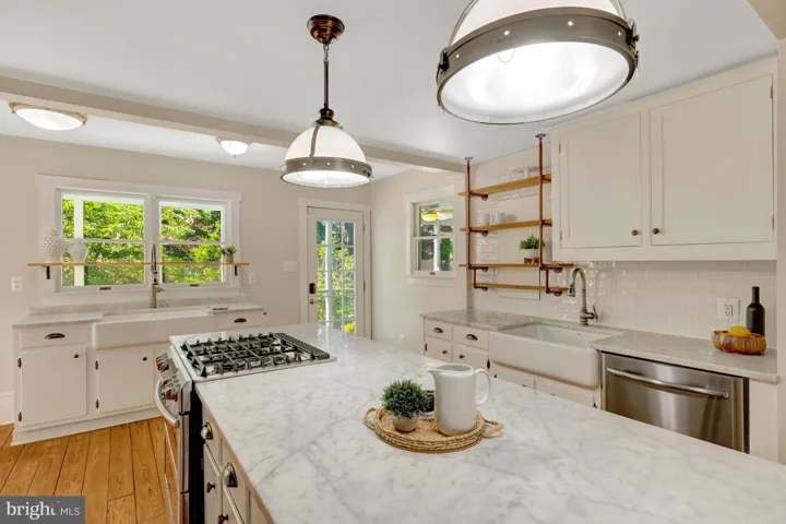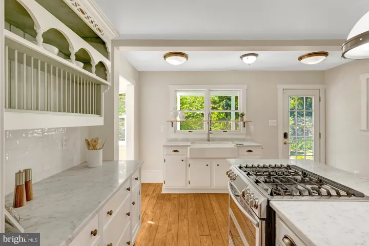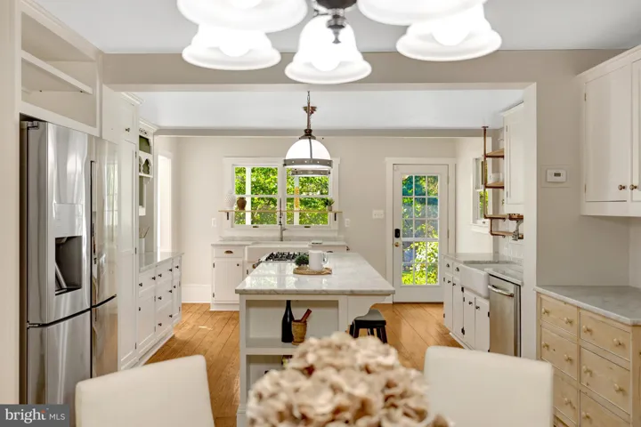 The dining room is ideal for entertaining, filled with sunlight and rich with period charm. And then there’s the kitchen: a chef’s dream! Fully renovated with marble countertops, premium stainless appliances, two oversized farmhouse sinks, and luxurious custom Smallbone cabinetry. The expansive island offers endless prep space and seating, and the adjoining breakfast nook is a wonderful spot for morning coffee.