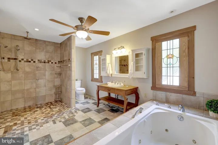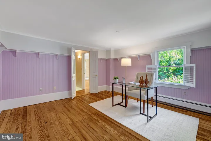 Head upstairs via your choice of two staircases, including a tucked-away set off the kitchen. The primary suite is spacious and serene, featuring garden views, ample closet space, and a spa-like bath with heated floors, a jetted tub, and a walk-in, door-free shower with multiple shower heads. An attached room—originally the primary bedroom—offers versatility as an office, nursery, reading room, or home gym.