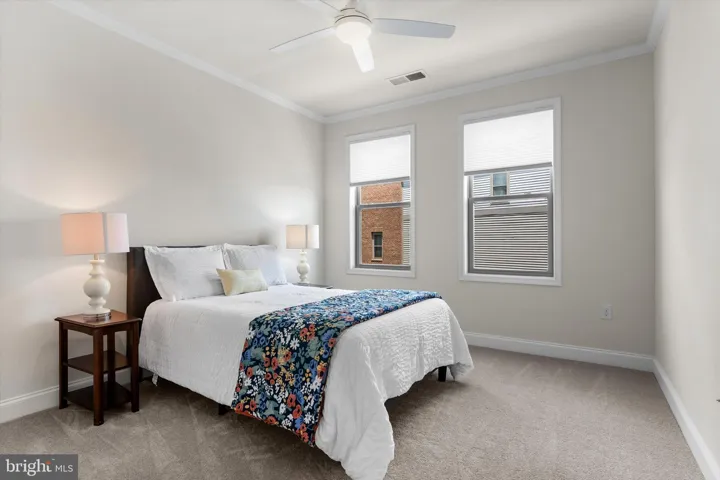 The primary suite is your private retreat, complete with a ceiling fan, LED lighting, a walk-in closet with custom built-ins, and a spa-inspired bath with dual vanities and a step-in shower with grab bars. | Two additional bedrooms offer flexibility for guests or a home office. | The laundry room is thoughtfully equipped with upper cabinets and a full closet for everyday organization.