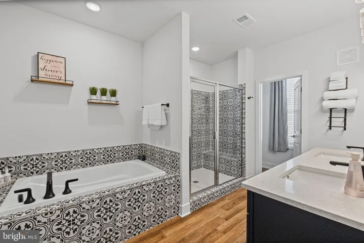 Featuring over $30K in upgrades including ones not offered by the builder, you will find an upgraded kitchen with quartz counters, quiet close cabinets, a farmhouse sink, a slide in double range (griddle and air fryer equipped), and exceptional walk in pantry with solid wood shelving. Each bathroom has been fully enhanced with upgraded fixtures, lighting, and comfort height toilets. The home also CATV ports in every bedroom and additional outlets throughout adding to its modern functionality. Luxury vinyl plank flooring throughout the primary suite level including the bathroom which showcases an upgraded custom tile offers a spa-like retreat! Additional highlights include an eye-catching accent wall in the foyer, cordless blinds, and a smart thermostat.