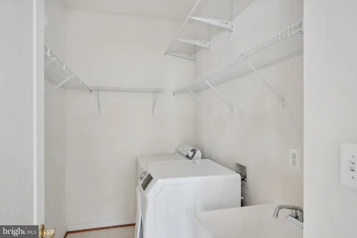 Conveniently located on the upper level, the laundry room comes with overhead shelving, adding extra storage space for your convenience. The home is equipped with a dual HVAC system to ensure year-round comfort.