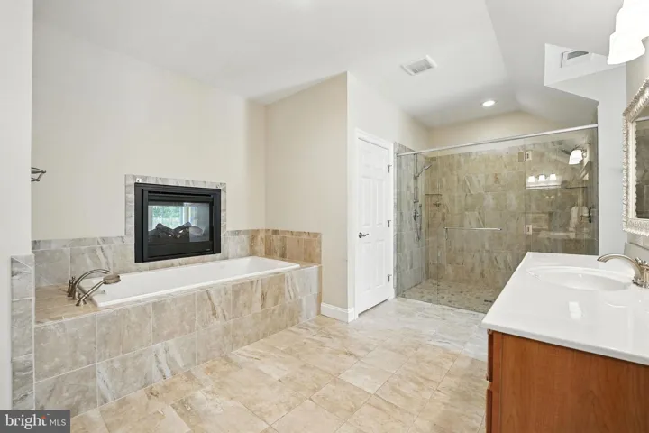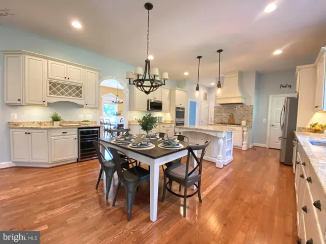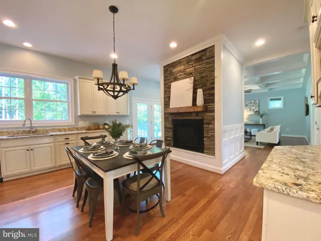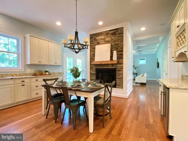 A spectacular Family Room with coffered ceilings, features a gas fireplace and floor to ceiling windows offering views of the peaceful backyard and the scenic fairway just beyond. The amazing Gourmet Chef’s Kitchen is equipped with upgraded cabinetry, stainless steel appliances, granite counters, built-in buffet, Butler’s Pantry with Wine Bar and beverage fridge, and a large center island. The adjoining breakfast area with a spectacular stone fireplace adds character and warmth, providing an inviting atmosphere to prepare meals and entertain with family and friends.