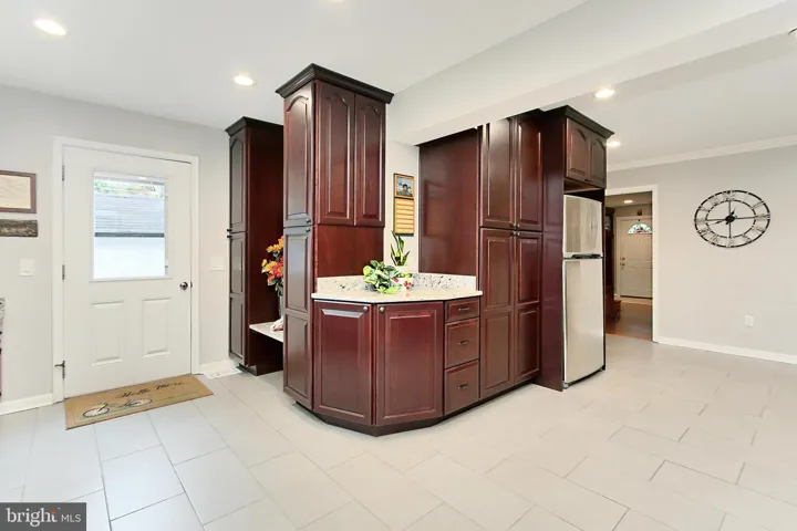 The heart of the home is the massive kitchen addition, featuring abundant cabinetry, granite countertops, stainless steel appliances, tile flooring, and a built-in coffee bar that’s sure to delight. The spacious layout is ideal for entertaining and everyday living. A refined living room with a wood-burning fireplace, a generous family room with direct access to the rear patio, and refinished hardwood floors on both the main and upper levels enhance the home’s warmth and charm.