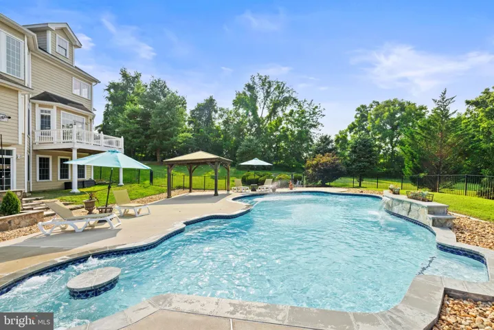 The fully finished walkout lower level is designed for entertaining on a grand scale, featuring a custom bar, entertainment lounge, and seamless access to a resort-style outdoor oasis. Step outside to find a sparkling in-ground pool with waterfall features, an expansive travertine patio, built-in fire pit, and multiple seating areas all designed for unforgettable gatherings under the stars.