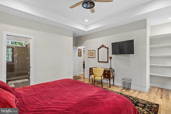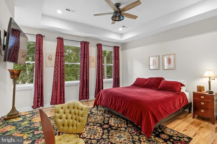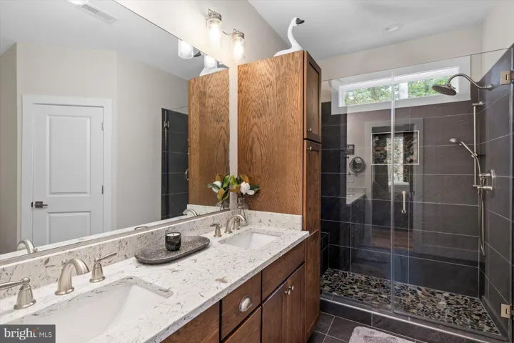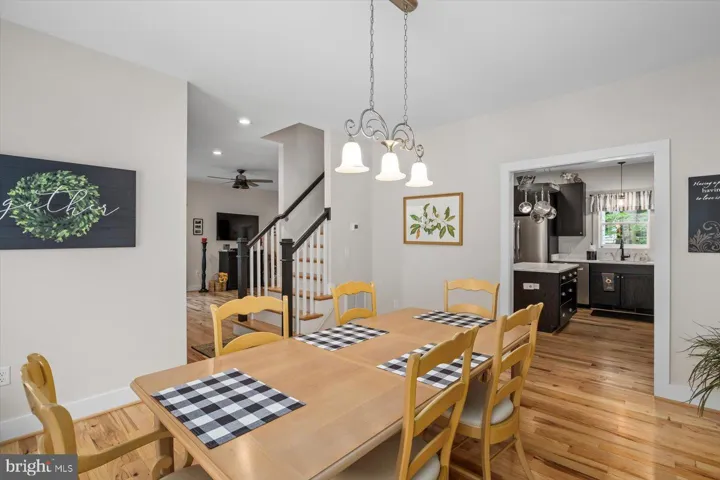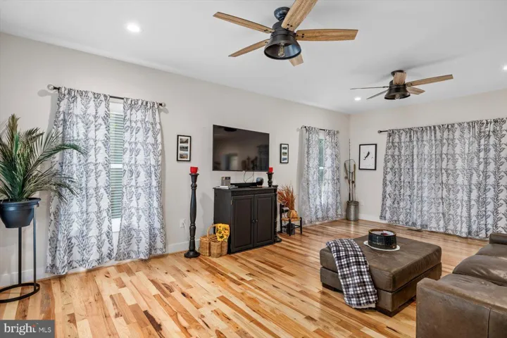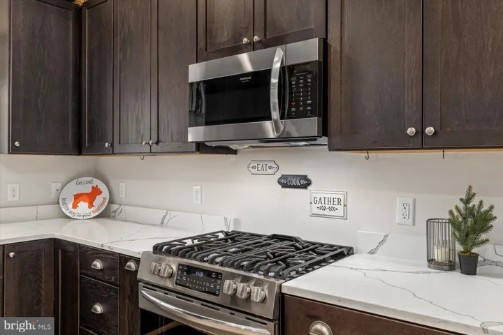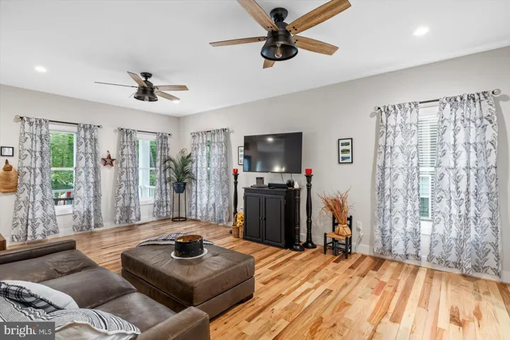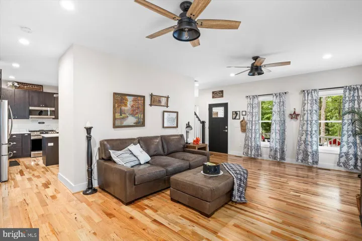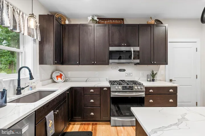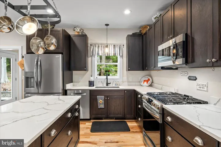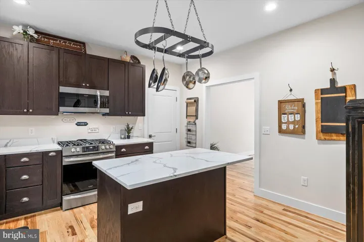 Step inside to discover rich hickory hardwood flooring throughout the main living areas, complemented by elegant tile in all three full baths. The main level is bright and inviting, anchored by a gourmet kitchen featuring gleaming quartz countertops, stainless steel appliances, a spacious walk-in pantry, and abundant cabinetry.