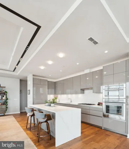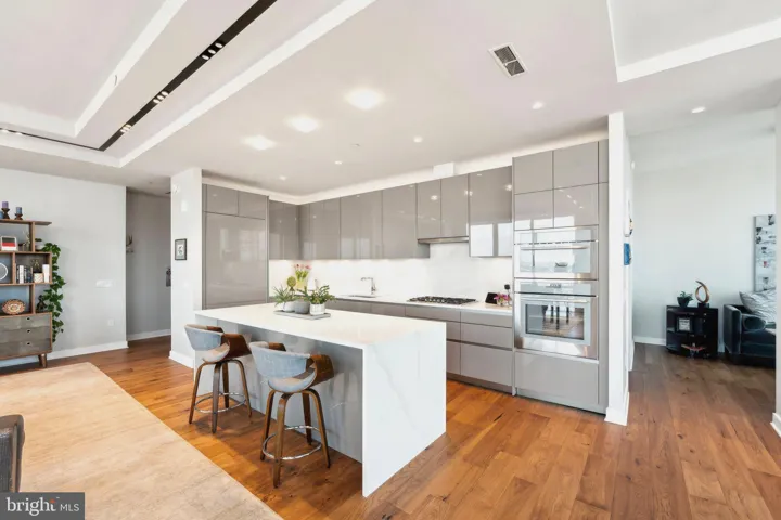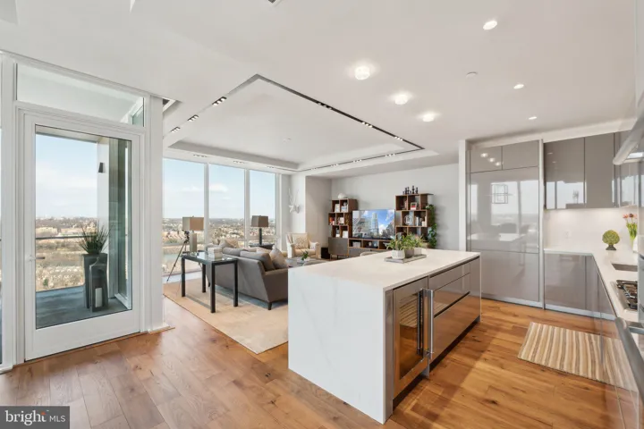 Floor-to-ceiling windows frame mesmerizing skyline views, while a private balcony provides a serene retreat to unwind in the glow of the city lights. Designed for comfort and refinement, every detail in this home reflects top-tier craftsmanship. The chef’s kitchen is a masterpiece, featuring Thermador appliances, sleek Snaidero cabinetry, and polished quartz countertops. A spacious waterfall-edge island is a striking focal point and a perfect gathering space. Thoughtful additions—such as a 42-bottle Thermador wine refrigerator, Wi-Fi-enabled wall oven and microwave, Bosch 800 Series dishwasher, and a walk-in pantry—make this kitchen as functional as it is stunning. The expansive living and dining area is ideal for entertaining, whether hosting an intimate dinner or a lively gathering. Hand-scraped hickory floors throughout the home add warmth and timeless charm.