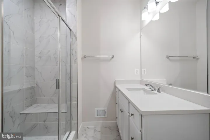 Upstairs, the spacious primary suite offers a large walk-in closet and spa-like en suite bath with a glass-enclosed walk-in shower, bench seating, and dual vanities. Two additional bedrooms share a full bath with double sinks and a tub/shower combo.
