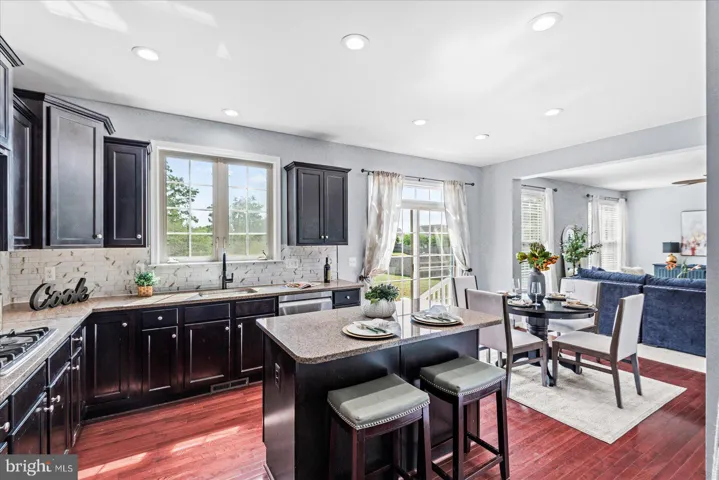 Updated gourmet kitchen with granite countertops, espresso cabinets, stainless steel appliances, and a stylish new backsplash