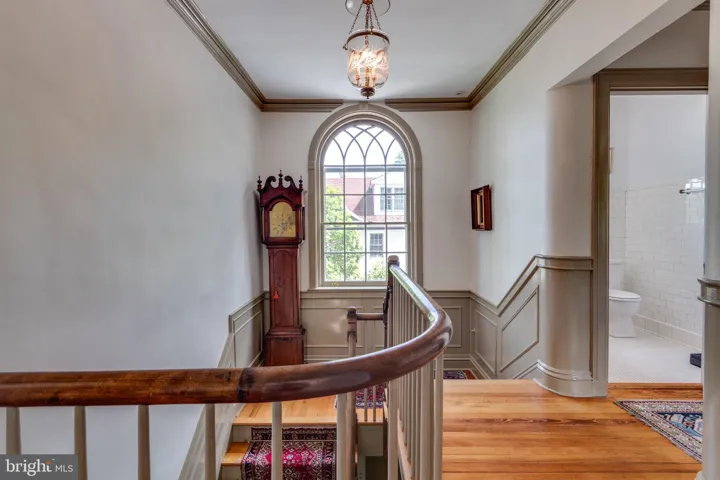 The upper level offers three bedrooms (one is currently being used as a library) plus two and a half baths.  The third level features a fourth bedroom with an adjoining room that could serve as an additional bonus bedroom or playroom.   Don’t miss the four charming quarter-room windows on the third floor.  The attic is accessible from the third level.  The full unfinished lower level offers abundant storage plus a wine cellar.