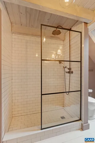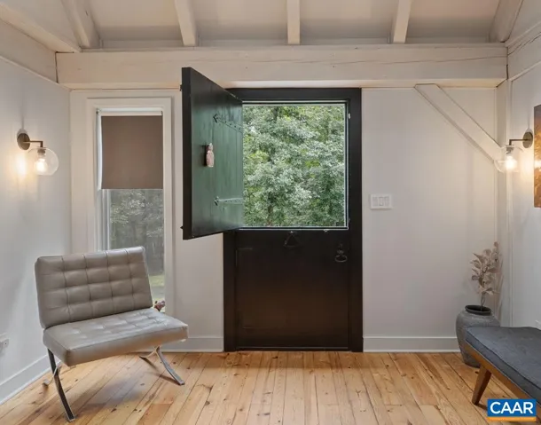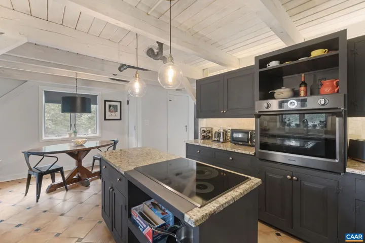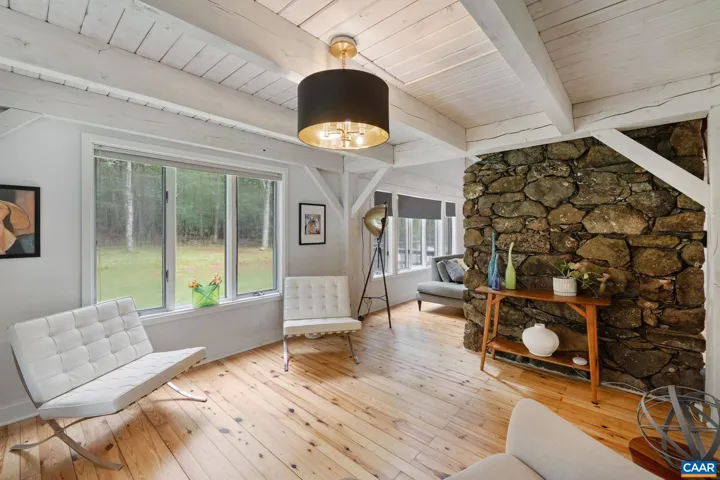 Experience contemporary design and classic craftsmanship in this custom post-and-beam home on four acres in historic Advance Mills Village. Enjoy winter mountain views from this southern-facing residence, offering 3,150 finished square feet on three levels. Inside, natural wood surfaces abound?PA hemlock posts and beams, cypress exterior, and pine floors and ceilings. A floor-to-ceiling stone fireplace and wood stove add cozy charm. The chef?s kitchen features stainless appliances, granite counters, an induction cooktop, a convection wall oven, and heated Italian ceramic tile floors. Energy efficiency is ensured with R-22 walls, Anderson windows, and six ductless mini-split systems. A professionally conditioned crawl space and southern orientation help keep energy costs low. A spacious third-floor great room offers loads of potential. Surrounded by mature hardwoods, this home combines timeless style with modern convenience and flexible living spaces. A short 10 – 15 minute drive to a variety of shopping and restaurant options. UVA Research Park and Rivanna Station are close by as well. Easy commute to DC via train or car.,Fireplace in Living Room