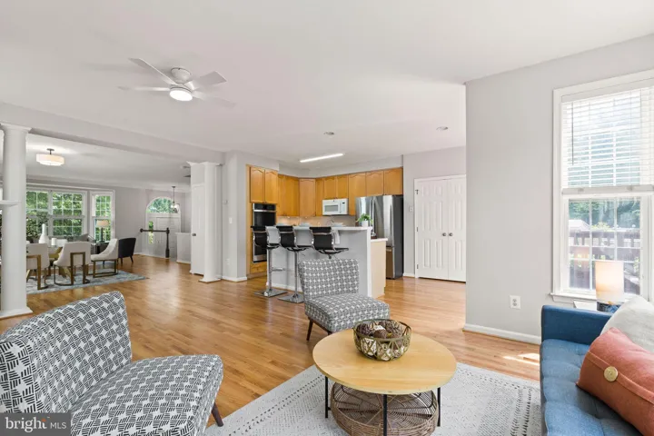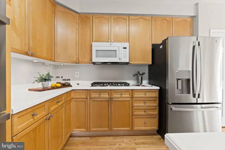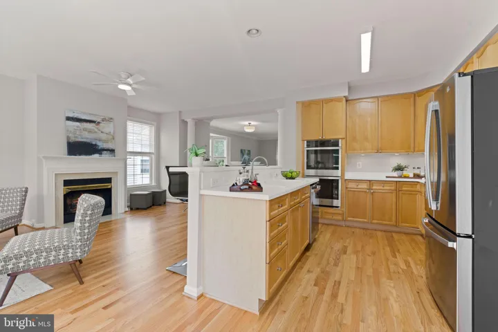 Light-filled, stylish, and freshly updated in 2025—this elegant end-unit townhome shines with modern upgrades and timeless appeal. Freshly painted in versatile Light Pewter with crisp white trim, the home feels bright, polished, and move-in ready. Newly refinished oak hardwood floors flow throughout the main level, leading to a kitchen upgraded with brand-new GE stainless steel appliances and modern LED lighting. Step outside to the freshly painted deck with an automatic awning—your own outdoor living room, perfect for morning coffee, evening grilling, or quiet relaxation.
