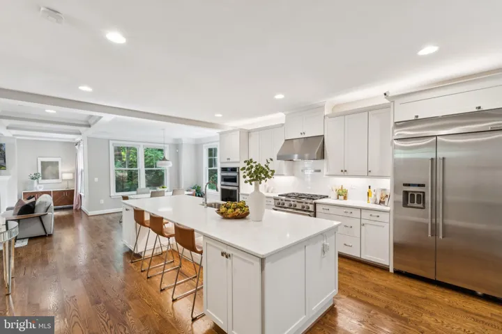 Step inside to find a beautiful open floorplan on the main level, featuring a gourmet kitchen with top SS appliances, quartz countertops, soft close shaker cabinets and drawers, double ovens, oversized sink, 6 burner gas range, a range hood, and a large island with extra seating and storage, that seamlessly overlooks the living and dining spaces—ideal for entertaining. The main level is complemented by a spacious office with built-ins, a breakfast nook, a mud room with access to the garage, a half bath, and a XL pantry. Gleaming hardwood floors flow throughout the home.