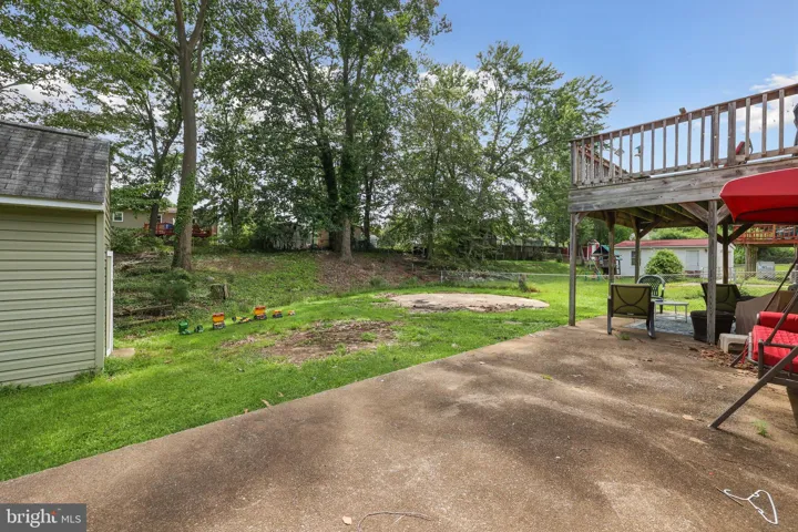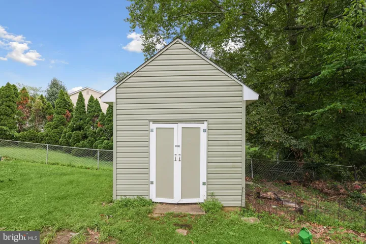 The level lot includes mature trees, privacy fencing, and a large storage shed with double doors—perfect for outdoor tools, bikes, or workshop space.