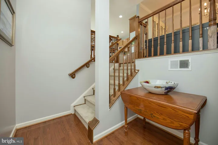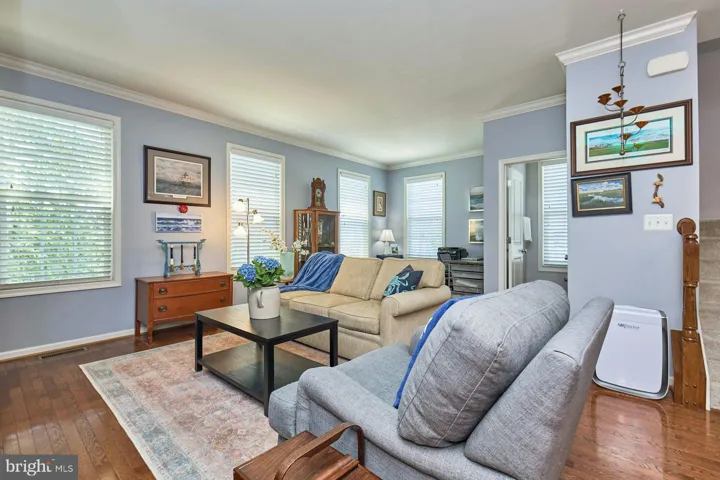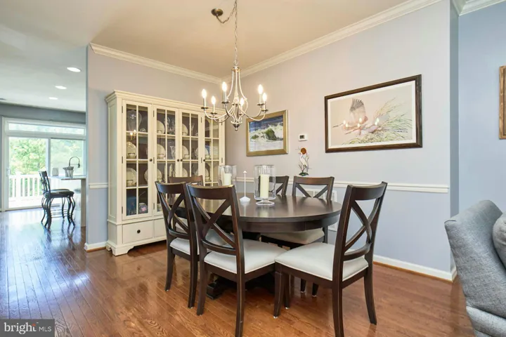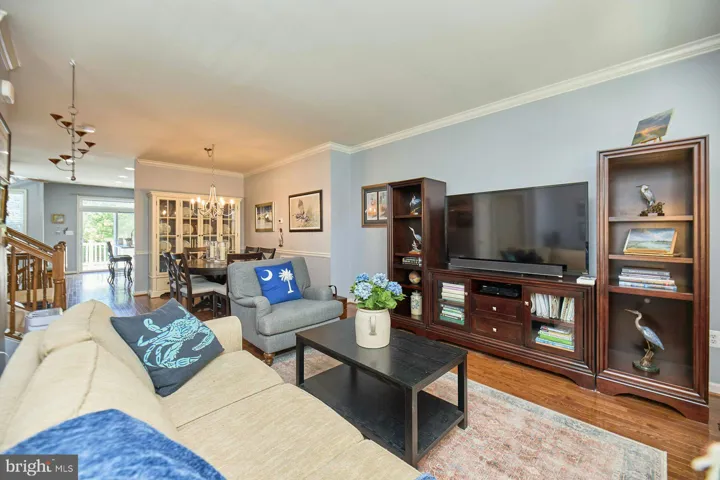 The main level features elegant hardwood flooring in the living and dining rooms, enhanced by crown molding and chair rail accents, adding timeless charm to the formal spaces. A convenient powder room is also located off the living room.